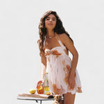 Mini Lilled Kleid kiirgab puhtat romantikat – õrnade lilledega pastelltoonides, halter-kaelusega ja kergete šifoonkihiga, mis langevad võluvalt. Täiuslik aiapidude, suvebrunchide või klaasi roosa veiniga päikese käes.